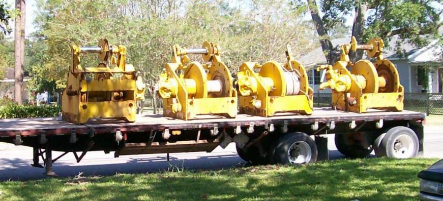 The air tuggers below are completely rebuilt the winches were disassembled then inspected for wear and damage. Then any machine work and parts needing replacement are replaced. Now the parts are blasted to the metal and zinc primed. The brake band is relined and the drum brake surface is machined. The winch is ready for assembly to specifications and load tested to 125% of rated capacity as manufacturer requirements. Once given the passed test it goes back to the paint booth and gets a epoxy primer/sealer and finally urethane top coat for color extra protection in the Gulf Of Mexico environment. Safety and operation labels are put on to complete the tugger. This comes with a 90 day warranty in house, same as the OEM rebuilt units.